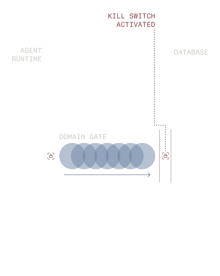 Policies and kill-switches can be applied at the Domain level to block categories of actions or halt execution when unsafe behavior is detected. Permissions can be scoped narrowly to limit what agents are allowed to request.